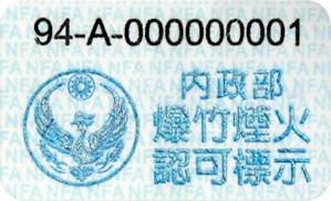 1. 一般爆竹煙火經過專業檢驗機構個別認可檢驗合格後,將於煙火製品上附加一個別認可標示,其尺寸為長度2.5公分,寬度1.5公分並應有防偽設計及標示認可年份及流水編號,其樣式如下: