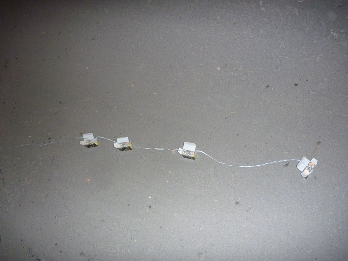 第二步~先預設施放順序,將最後一組先行做串連動作~(如圖一最右邊先串連,依序串聯,在施放時順序就會從左至右,依序燃放!~)