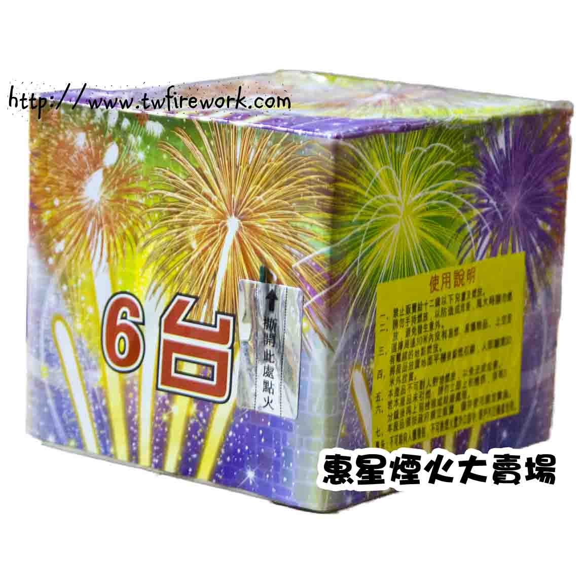 商品屬性 [煙火發數/盒] 6發 [燃放時間] 約16~20秒 [拍攝距離] 約10公尺 [燃放說明] 將煙火平放.點燃引線後快速遠離20公尺觀賞 [注意事項] 請選擇空曠.周圍無易燃物之地點施放本商品不當使用可能造成傷害!請務必遵守商品說明並小心使用,12歲以下兒童請勿購買 [尺寸&規格] 本體長13公分、寬13公分、高11.5公分;效果藥管長11.5公分、外徑2.5公分、內徑2.0公分 [效果藥管成分] 過氧酸鉀、硝酸鉀、鋁鎂合金、硫磺、木炭、聚氯乙烯、氧化銅、碳酸鍶、硝酸鋇、冰晶石、鋁粉、鈦粉、對苯二甲酸氫鉀、糯米粉、酚醛樹酯、蟲膠 [認可證書字號] 爆型証字第101-E-006716434號 [總火藥量] 6公克